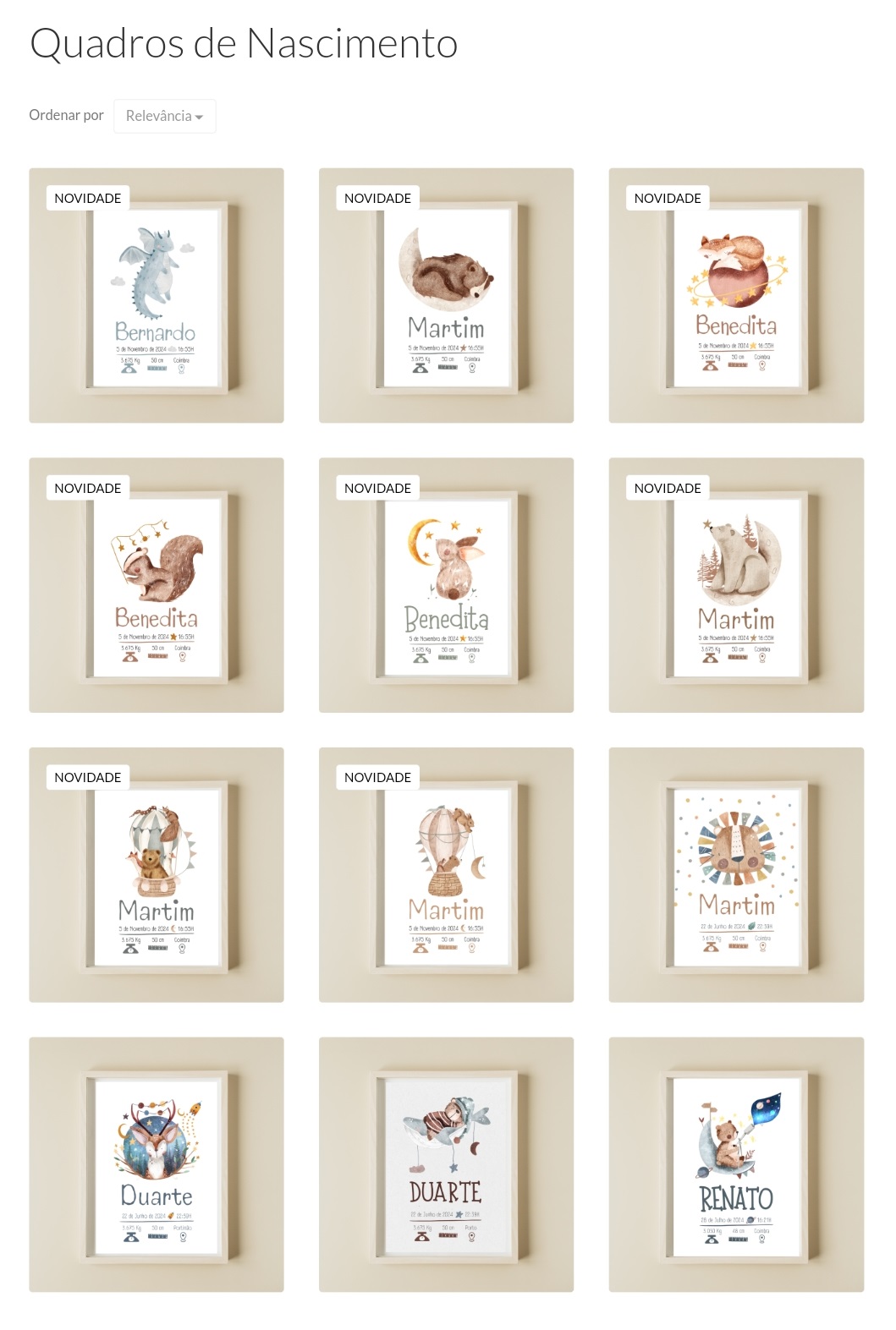 Os quadros de nascimento estão organizados por ilustrações e não pelo nome do bebé. Seria impossível ter uma lista de quadros de nascimento com todos os nomes disponíveis.