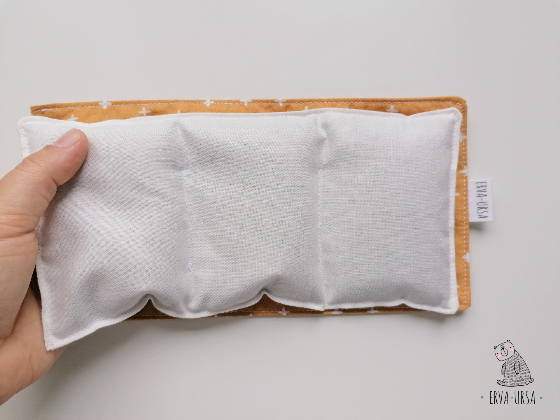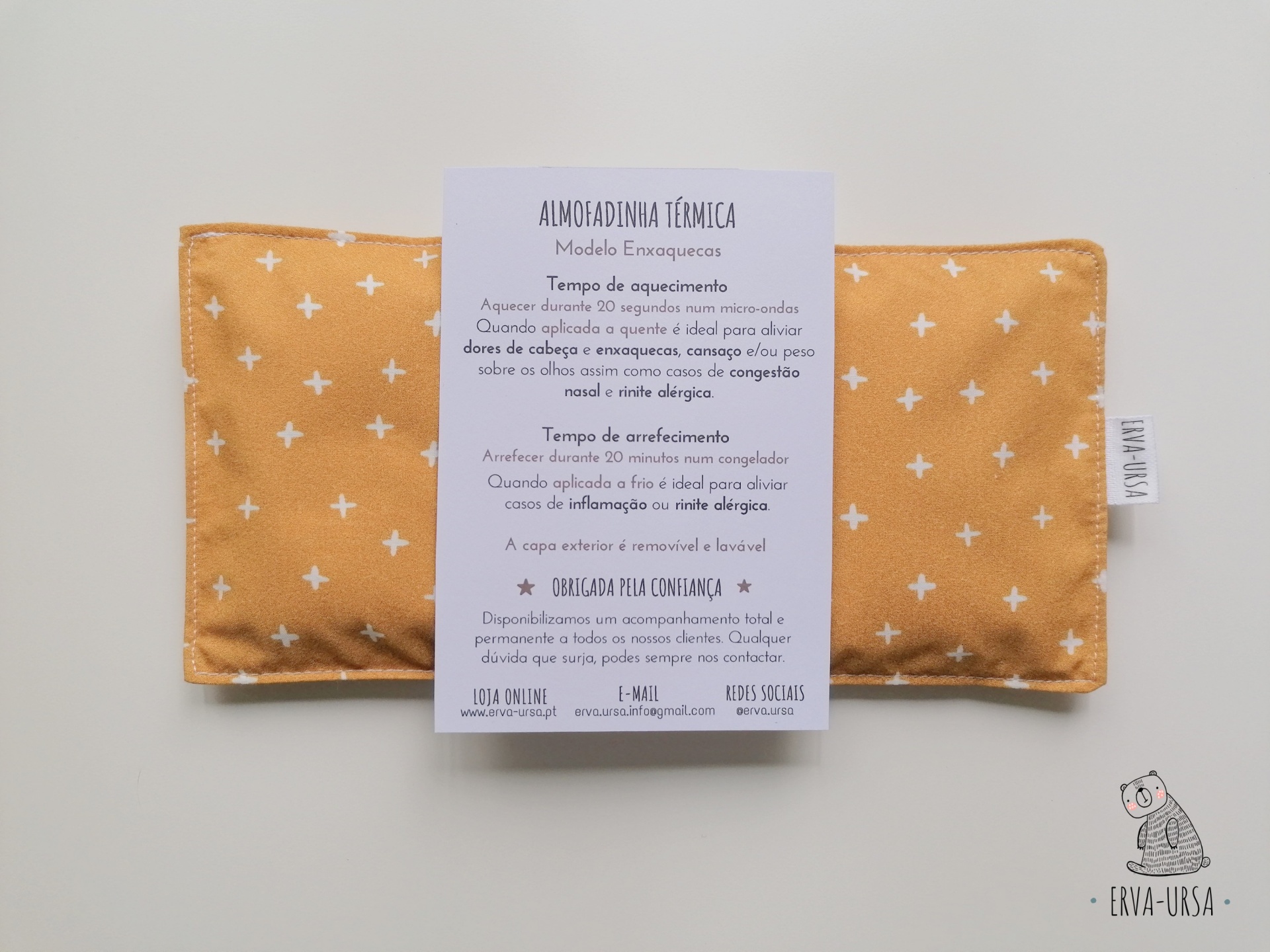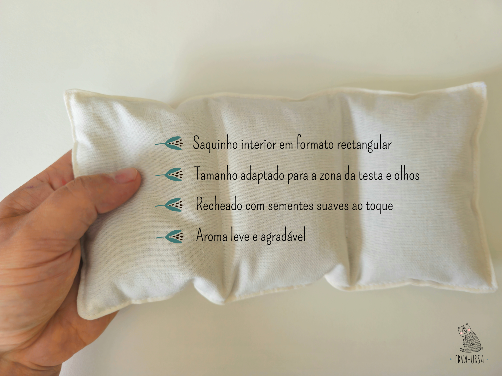Os benefícios desta almofadinha estão relacionados com o alívio de dores de cabeça, enxaquecas, cansaço e/ou peso sobre os olhos. Também pode ser aplicada a frio e/ou quente em casos de inflamação ou rinite alérgica.