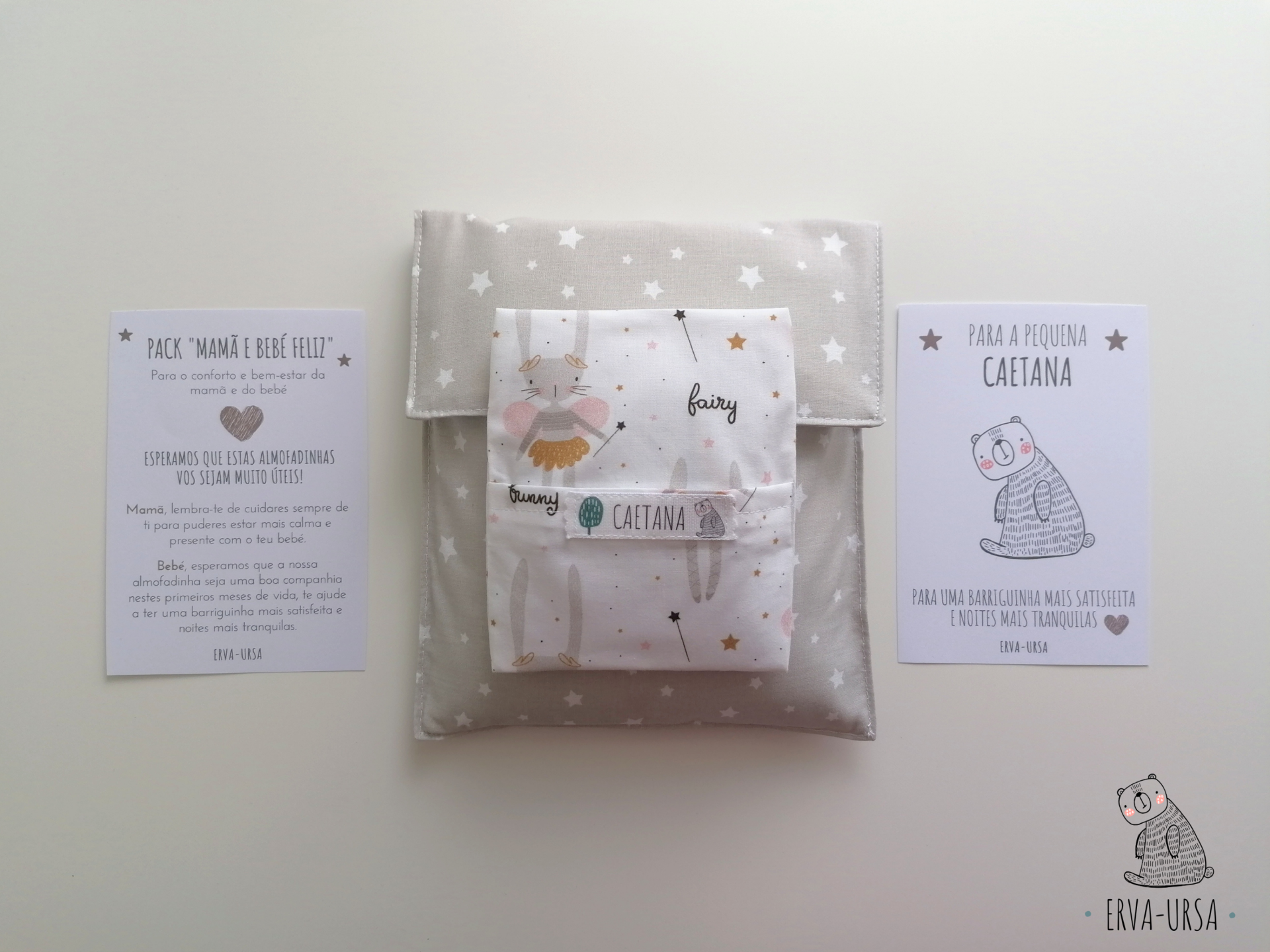 Constituído por uma almofadinha térmica para a mamã + uma almofadinha térmica anti-cólicas para o bebé + 6 almofadinhas de cheiro