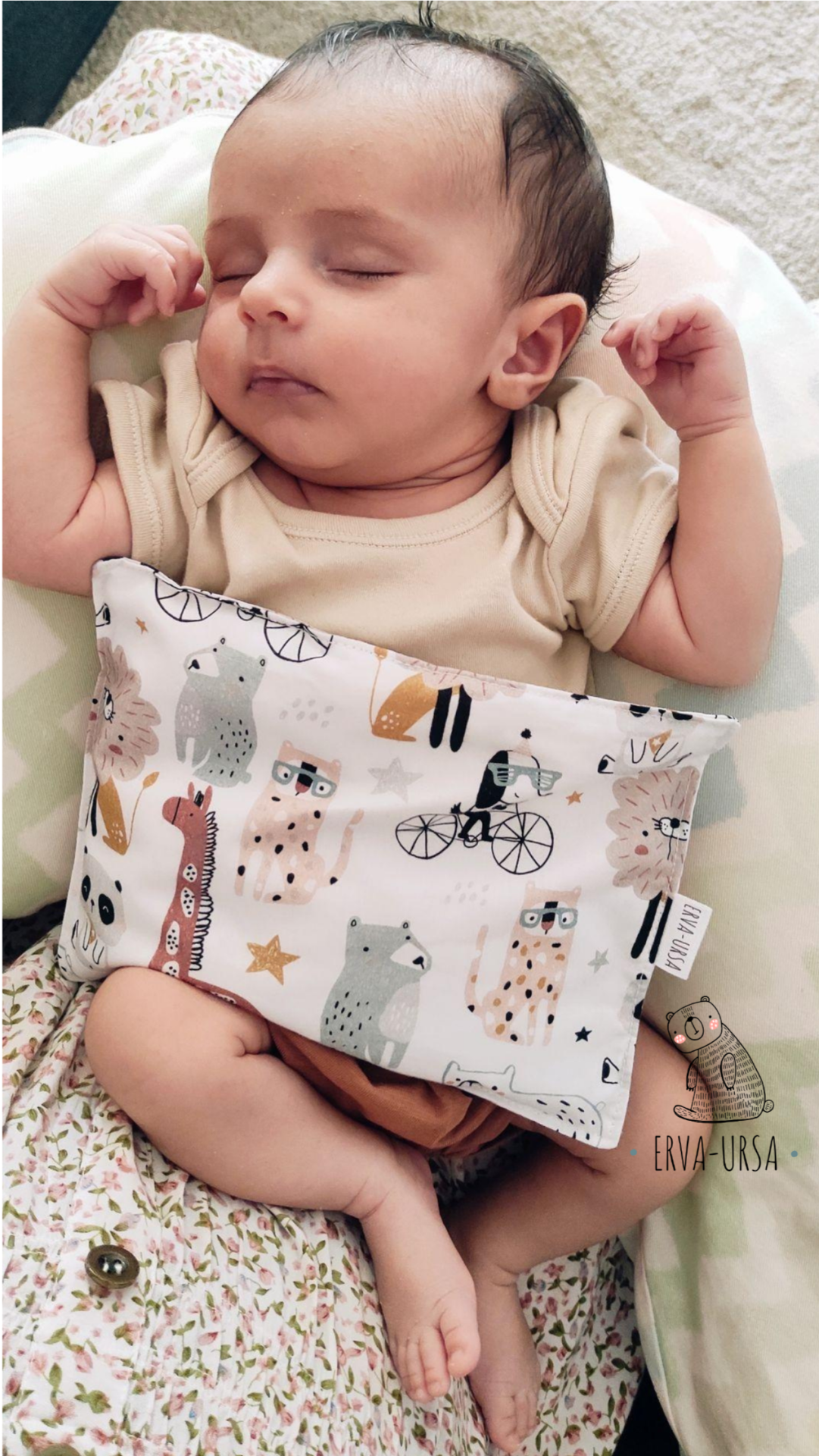 Esta almofadinha térmica é confeccionada especialmente para recém-nascidos e bebés até 1 ano e meio de idade;